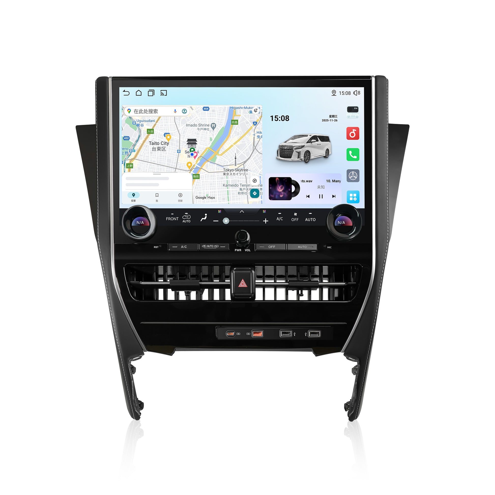Google マップ・Yahoo!カーナビなど人気のナビアプリを14.5インチの大画面でそのまま使用可能。常時インターネット接続によりリアルタイムの渋滞情報を取得し、クラウドベースの地図データを使用するため地図の更新が不要で、常に最新情報をもとにナビゲーションします。