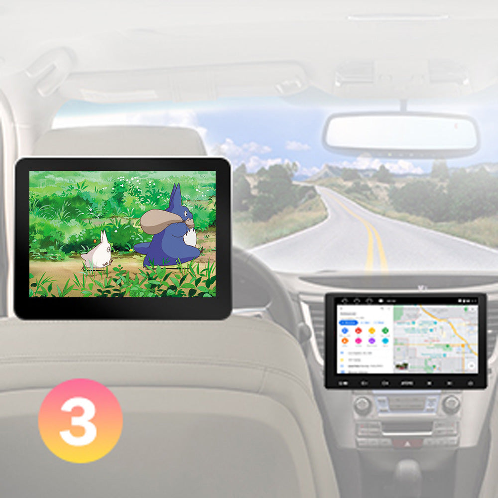 - 本体で再生中の動画・ナビ・音楽アプリの映像が、即座に後席画面に映る! → 前席はナビ運転に集中、後席は大画面アニメやキッズコンテンツで大満足